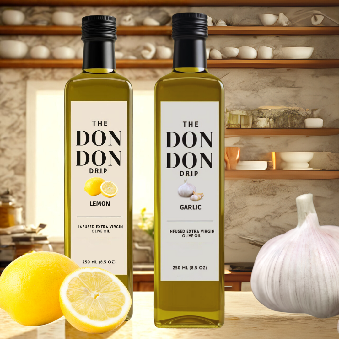 Introducing the Don Don Double Drip — two bottles of flavor-packed goodness, Lemon and Garlic infused extra virgin olive oils, designed to bring maximum drip to your kitchen. Perfect for chefs, home cooks, and flavor enthusiasts, this duo turns ordinary meals into unforgettable experiences.